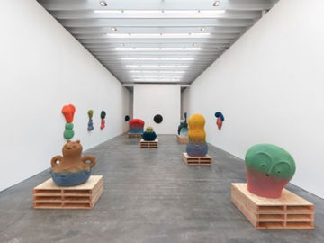 Camille Henrot's A Number of Things, marks her first major exhibition with the Hause & Wirth gallery. The show features a new series of large-scale bronze sculptures titled Abacus, inspired by children's developmental tools, footwear, distorted graphs, and ancient counting devices, exploring the tension between emerging imagination and societal systems of signs. Alongside these sculptures, Henrot presents vibrant new paintings from her Dos and Don'ts series, combining printing, painting, and collage techniques to playfully reinterpret etiquette books. Adding a whimsical and immersive element to the exhibition, the gallery also features a recreated dog park filled with playful dog sculptures, inviting visitors to reflect on the connections between human behavior, companionship, and the rules we create. A custom flooring installation, designed in collaboration with Charlap Hyman & Herrero, further transforms the space, making this a must-see, multi-sensory experience.